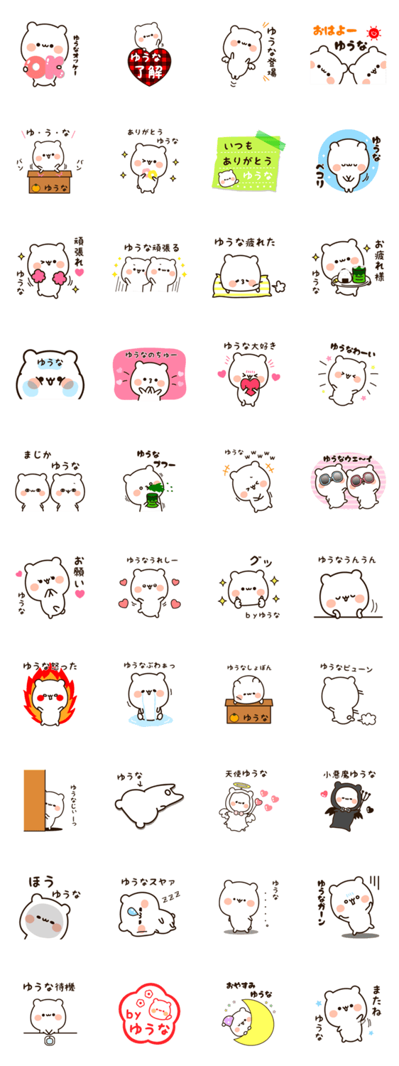 ゆうなちゃん・ゆうなさん等が使える名前スタンプです。使いやすい言葉を集めました☆