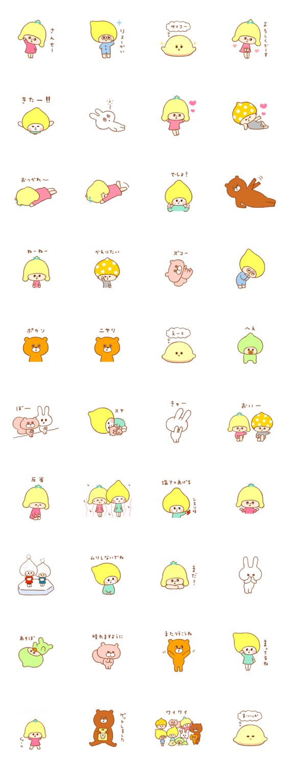 レモン姉妹になかまが増えました。レモン兄弟と謎のレモンケーキちゃんが加わって大人数で楽しいスタンプになりました。
