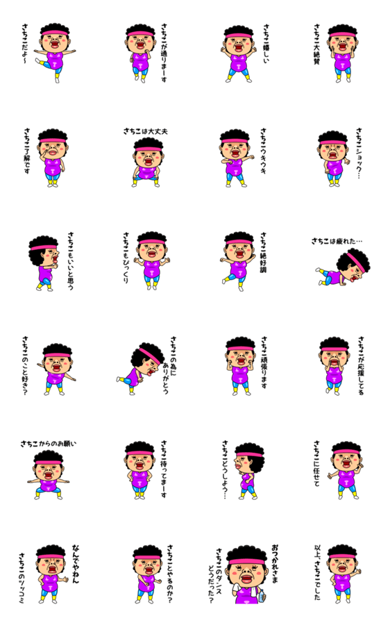 さちこおばちゃんがエアロビクスダンスで感情を表現します!全国のサチコ(幸子,祥子,早智子,佐智子,沙智子)さん専用の名前入り動画スタンプです。昭和レトロな一品★