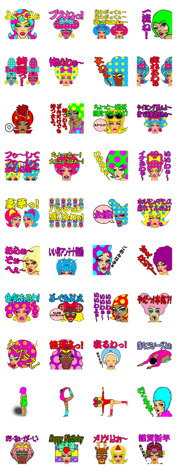 現役オネエが日常使ってる言葉(オネェ言葉)が、そのままスタンプになりました!派手なルックスをよりポップに仕上げた、どこにも無いキュートなスタンプです。