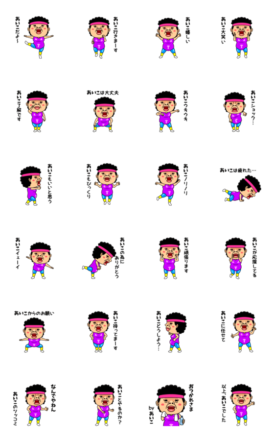 あいこおばちゃんがエアロビクスダンスで感情を表現します!全国のアイコ(AIKO,愛子,藍子,亜衣子,藍子,愛甲)さん専用の名前入り動画スタンプです。昭和レトロな一品★