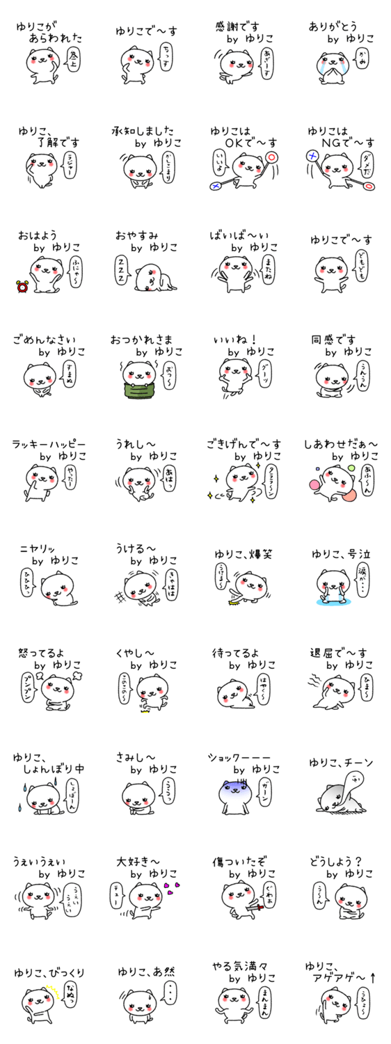 百合子、由里子、友理子、祐梨子…、全国の「ユリコ」さん専用の猫キャラ名前スタンプ、日常会話の基本セットです。友だちとお揃いで使える「ちゃんねこシリーズ」です。