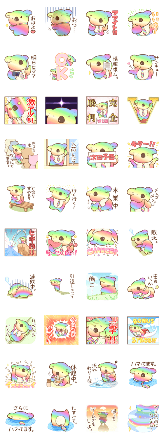 虹から生まれた妖精、カラフルコアラの日常を描きました。 果物が大好きなので与えてあげるととても喜びます。