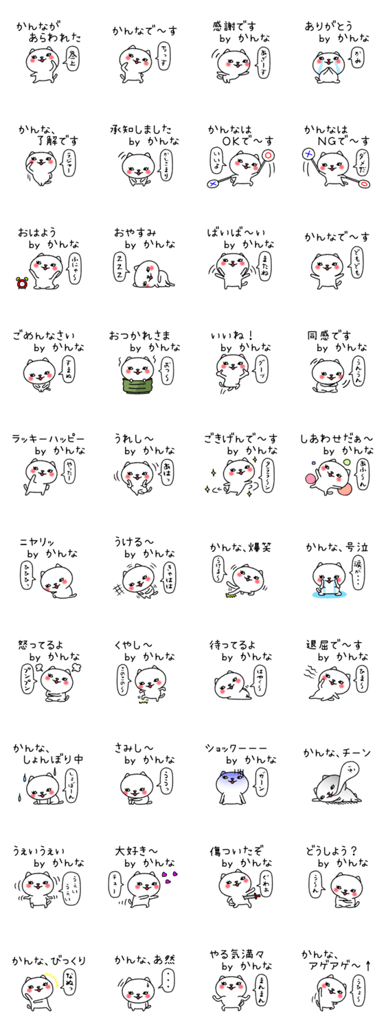 環那、環奈、神菜、栞奈、柑奈…、全国の「カンナ」さん専用の猫キャラ名前スタンプ、日常会話の基本セットです。友だちとお揃いで使える「ちゃんねこシリーズ」です。
