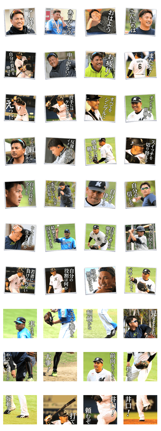 井口資仁引退記念スタンプ。 井口著書の「心の軸」から抜き出した井口資仁が大切にしている言葉を集めた意識高い系スタンプで、井口資仁を表したスタンプとなっています。