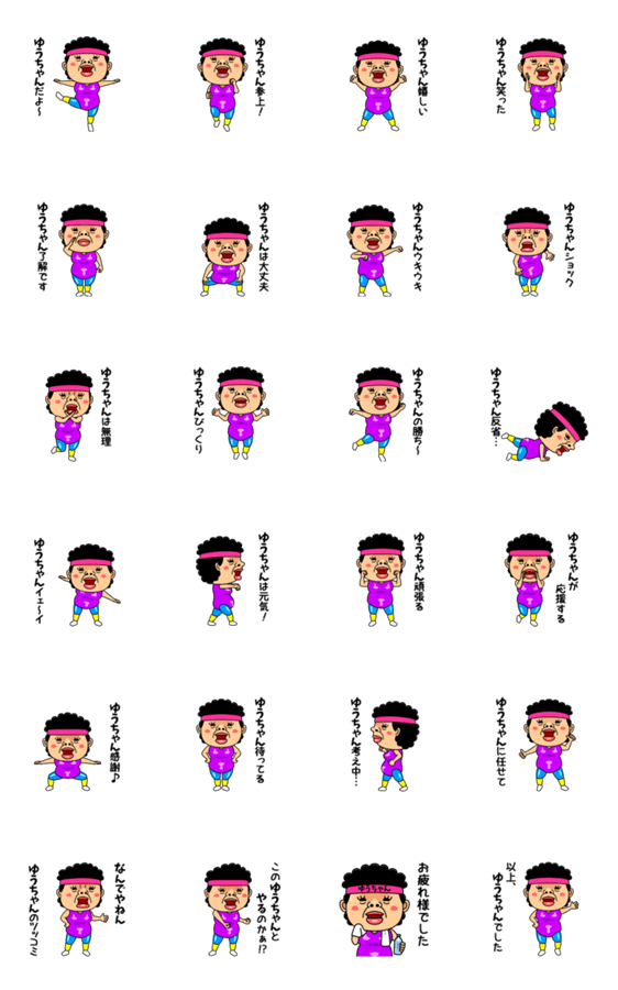 ゆうちゃんがエアロビクスダンスで感情を表現します!全国のユウチャン(ゆうこ,ゆうみ,ゆうか,ゆうな,ゆうき)専用の名前入り動画スタンプです。昭和レトロな一品★