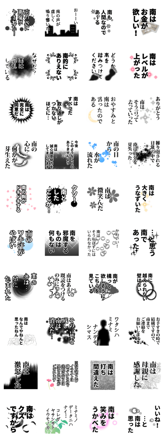 苗字が南(みなみ.ミナミ.さん等)名字が南さんのためのナレーション名前スタンプです!モノローグがうけます!