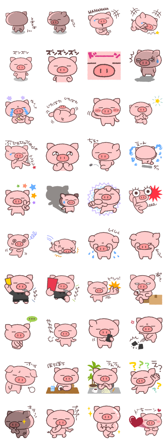 こぶたのぶたたが多彩なリアクションでトークを盛り上げます。「とぼとぼ」からの「ちらっ」、「ズンズン」→「ドーン」など連続して使うと楽しいスタンプも。