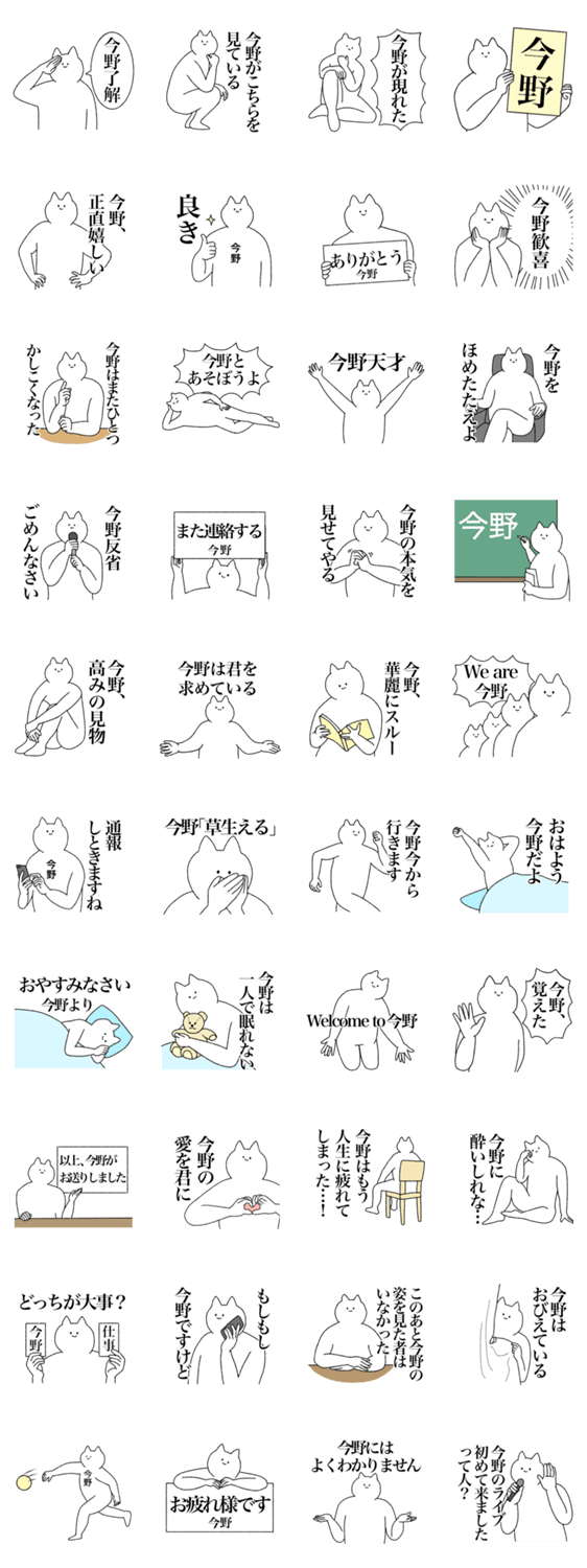 全国の今野(こんの、コンノ/いまの、イマノ)さんが使う名字のスタンプです。 可愛い面白いシュールな今野さん。
