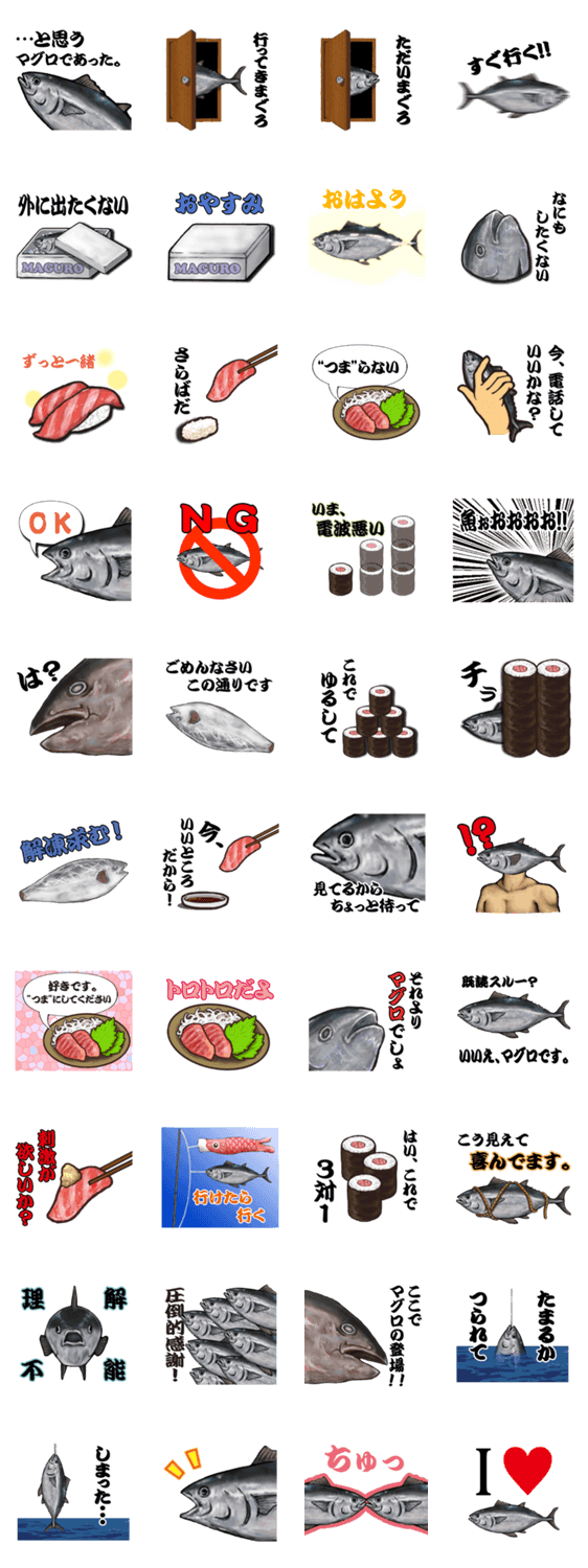 このマグロは寿司ではなく会話の”ネタ”として、またシュールなスタンプとして活躍いたします。使っているうちに可愛く見えてくるかも!?