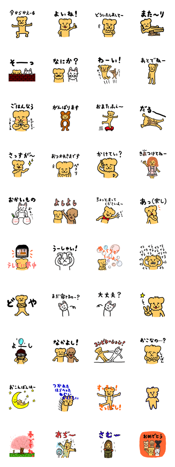 犬のパオチュのポップでクールでシュールなスタンプです。白犬ティアチと猫のチョビも大活躍!これでふぁいなる!