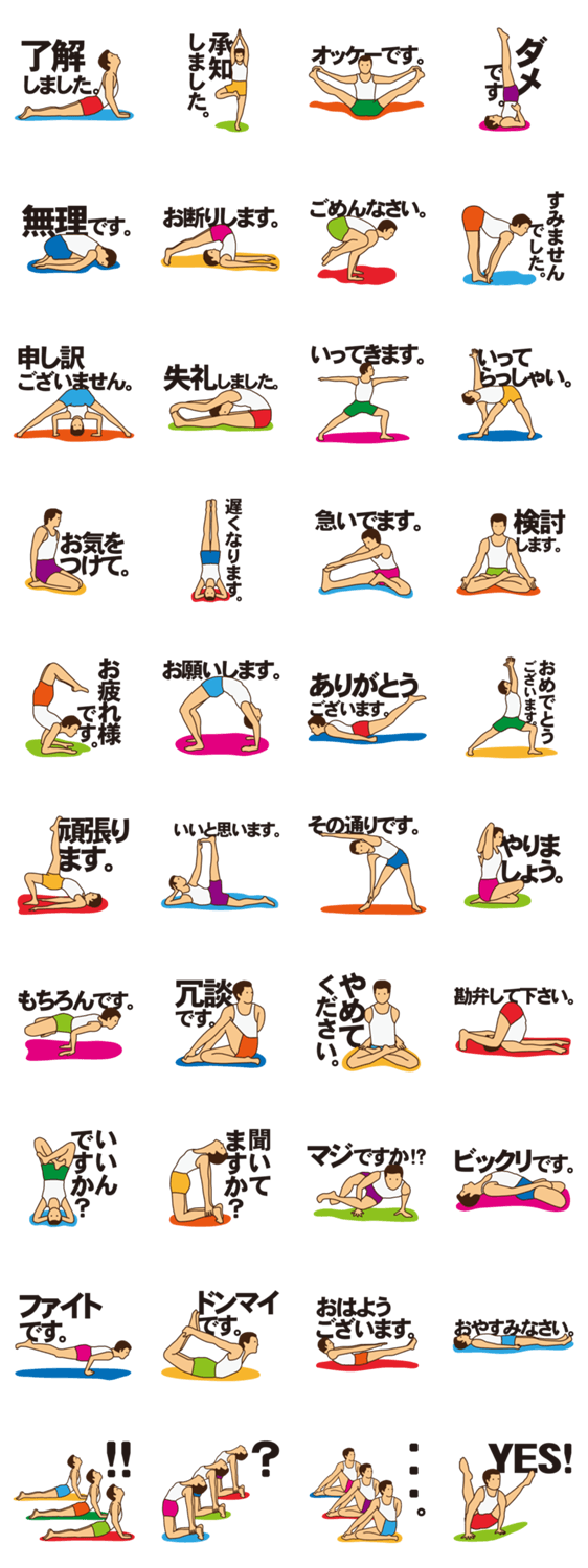 YOGA(ヨガ)のポーズと敬語のミスマッチさがなんとも言えない、様々なシーンで使えるちょっぴりふざけたスタンプです。