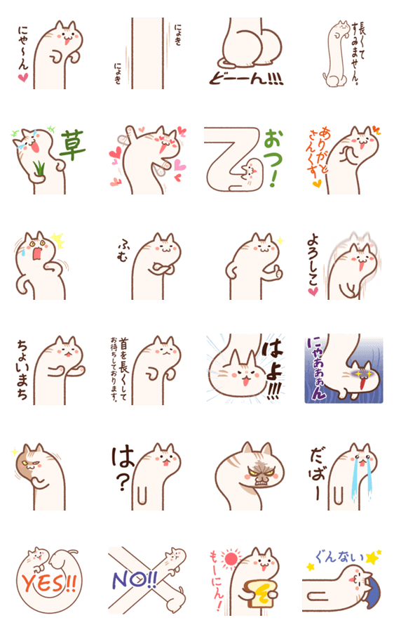 おモチのように胴が長〜く伸びるニャンコのスタンプです。