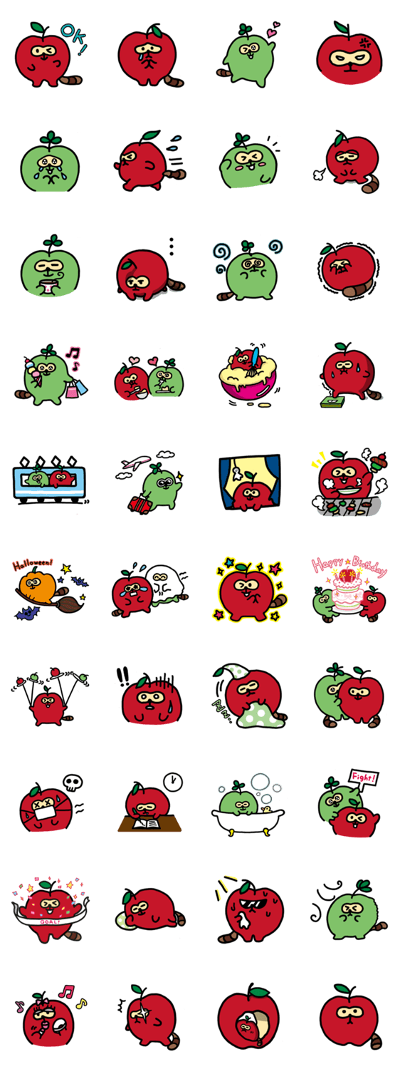 りんごに変身してみたタヌキたちのスタンプがついに初登場!何故りんご?など細かいことは置いておきましょう。赤と緑のコンビが巷に溢れる中、彼らは生き残れるのか…!!