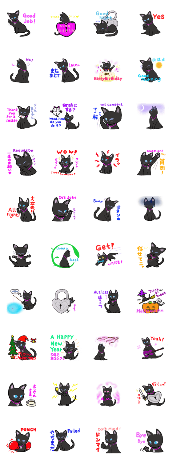 首に錠前を下げたクロネコのlockちゃん。鍵のペンダントのアメショーkeyちゃんとのカップリングスタンプです。仲のいい友達やラブラブの恋人達で使ってもらえたら嬉しいな