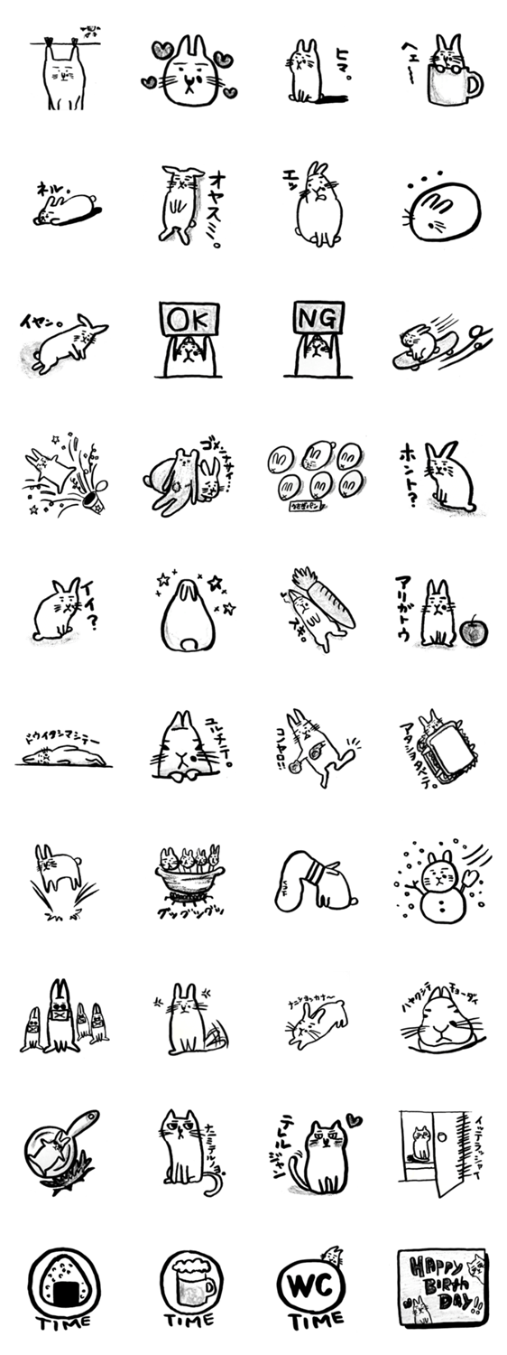 無表情なうさぎのスタンプです。鼻の横にあるホクロがチャームポイント。のんびり屋で猫の桜丸とお友達。