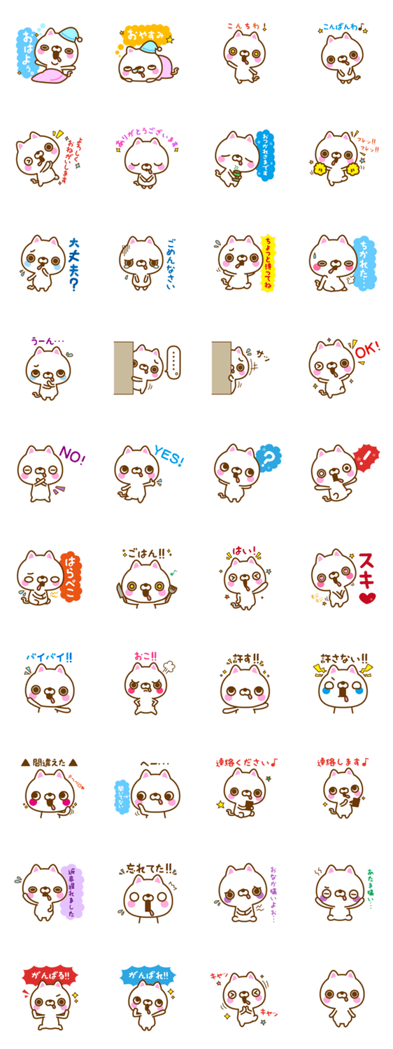 しろねこスタンプ『ぺろ』!!日常で使いやすいものを多めにご用意しました★カワイイ君にピッタリのスタンプだね(白目)!!