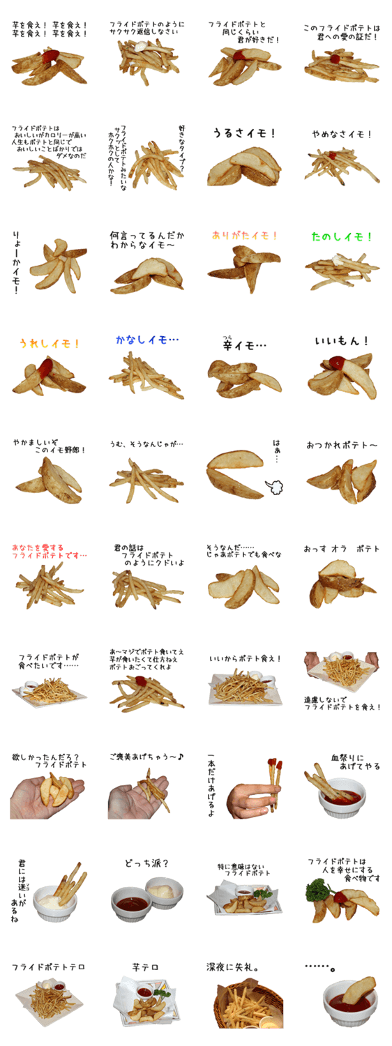 大人気フライドポテトの実写スタンプ第三弾です。ポテトって一度食べると止まらないですよね。超高画質フライドポテトをどうぞ。おつまみ、飯テロにも。イモ最高!40個入り