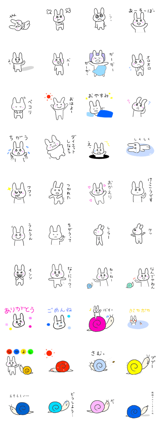 可愛いうさぎとかたつむりのスタンプです。正反対の二匹を使って楽しんでください。