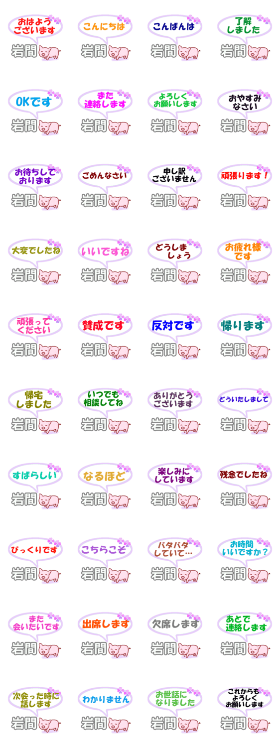 岩間「いわま」さん専用。おはようございます、了解、出席、欠席、賛成、反対など大人の丁寧な日常会話、連絡用にどうぞ