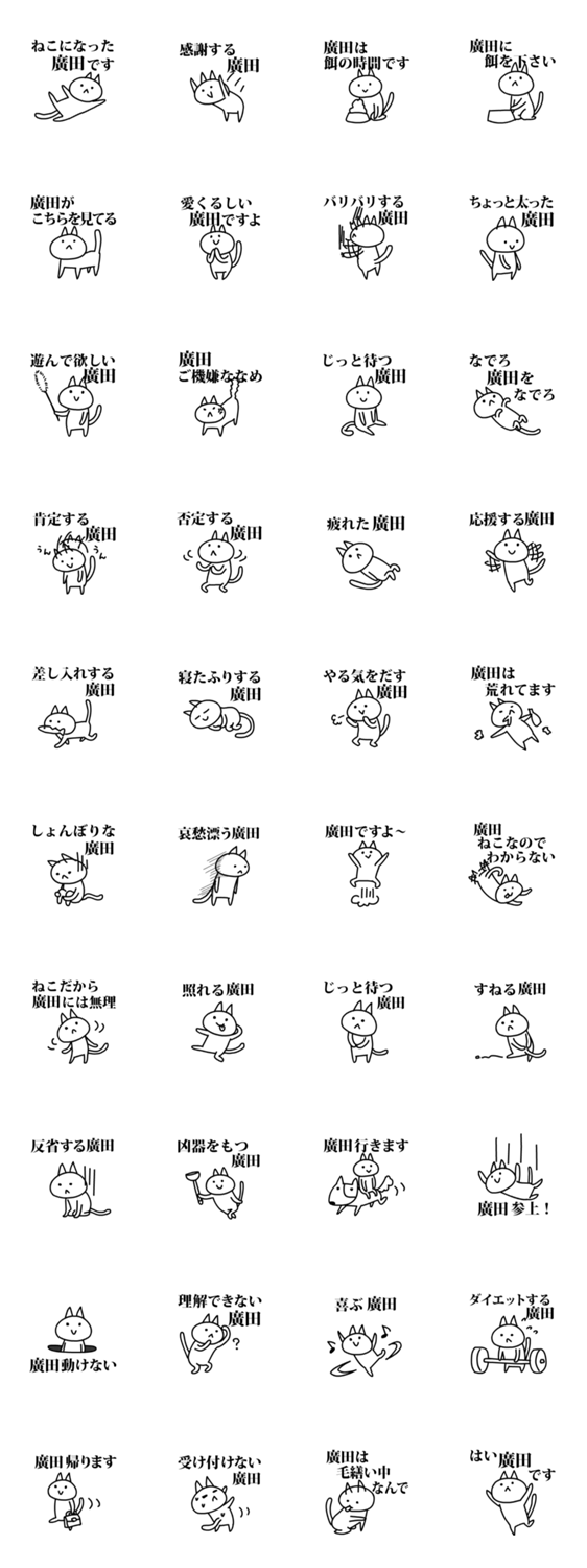 ねこになりました。その最高に愛くるしいかわいい仕草で、日常的に使えるスタンプです。苗字が入った名前スタンプなので毎日使えるんです。ニャー
