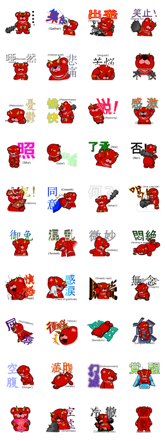 お腹かがコンプレックスの鬼熊のスタンプです。キャラクターが漢字の文字を表現しています。