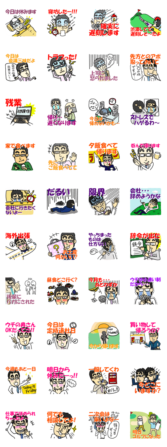 サラリーマン生活でのあるあるネタをスタンプにしました。会社だけでなく、奥さまに宛てるためのスタンプも充実させてみました。