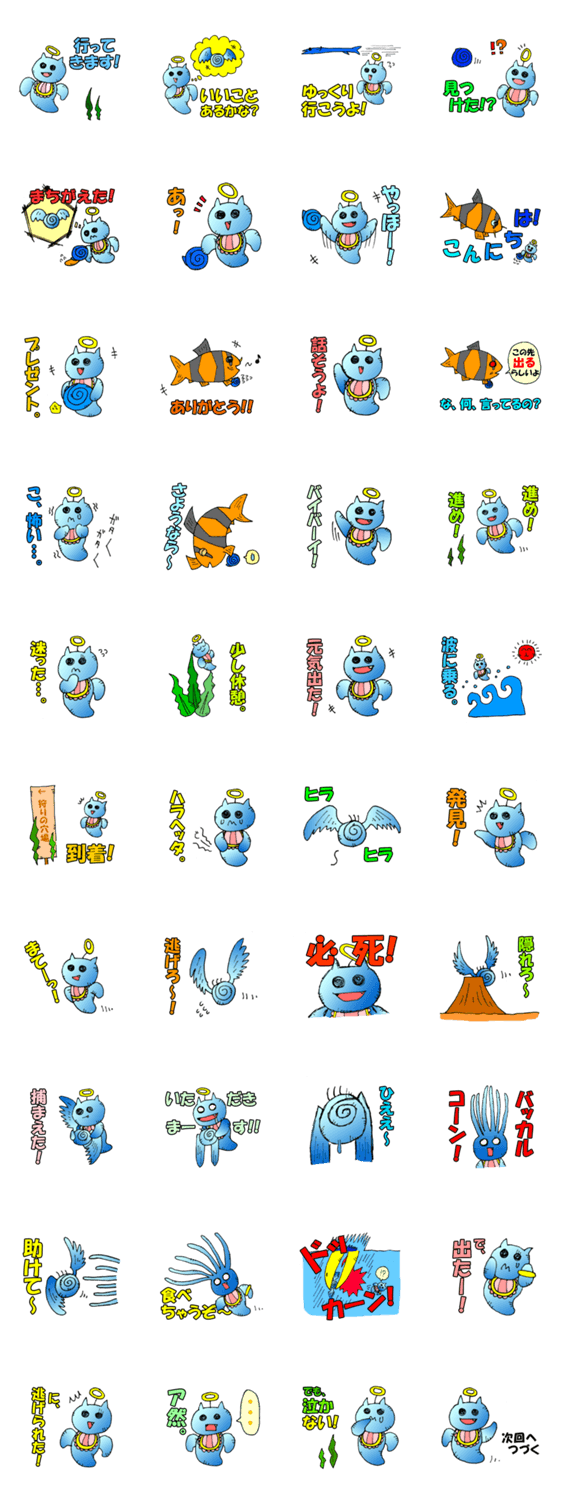 クリオネのクリオがエサを求めて旅立つ様子をスタンプにしました。つなげて読むと絵本になる40コマは、もちろんスタンプにも使えるよ。