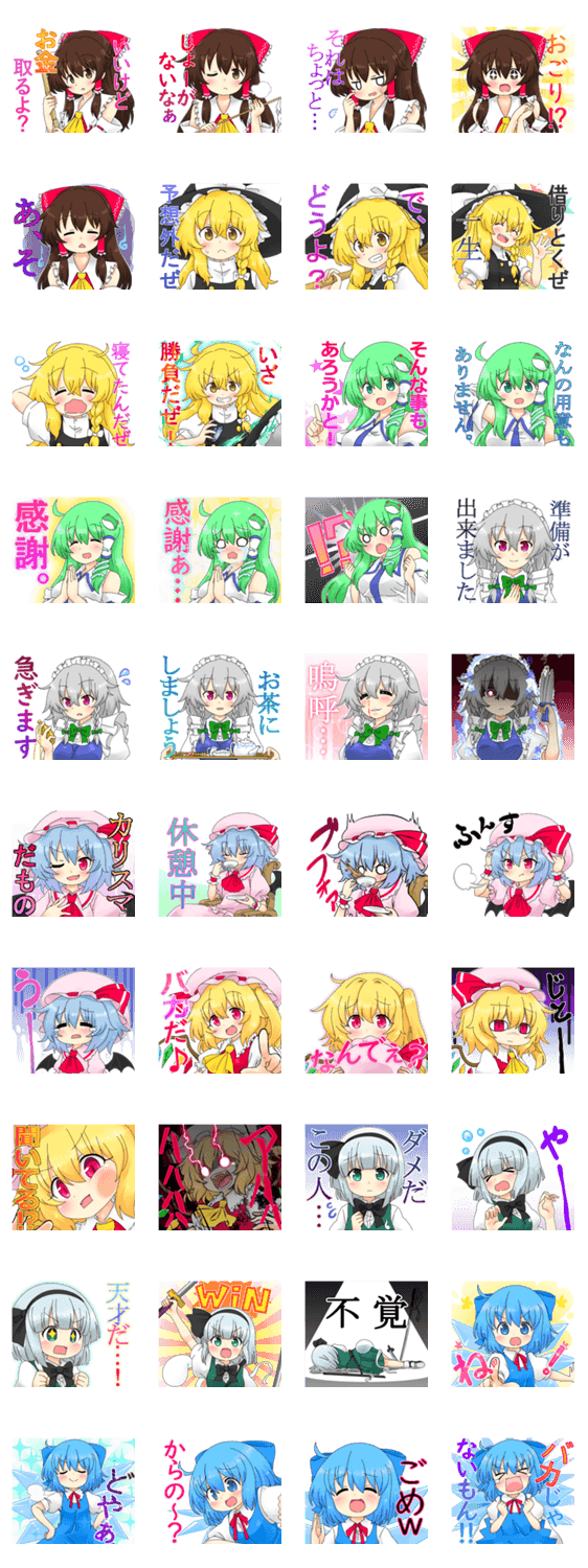 東方キャラ8人で、使いやすいスタンダードな言葉から、使い時に難儀する(?)スタンプを用意いたしました。 ぜひ会話のネタにいかがでしょう。