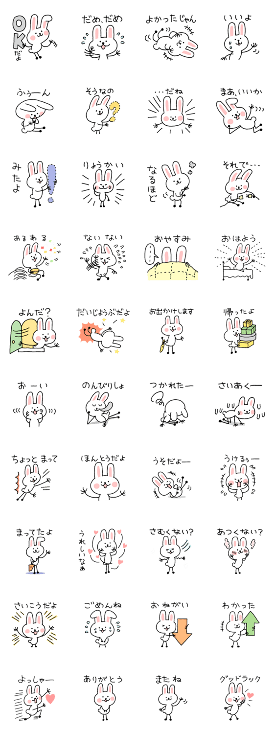 らくがきうさぎ、略して「らくうさ」スタンプです。ふだん頻繁に使う言葉をチョイスしました。