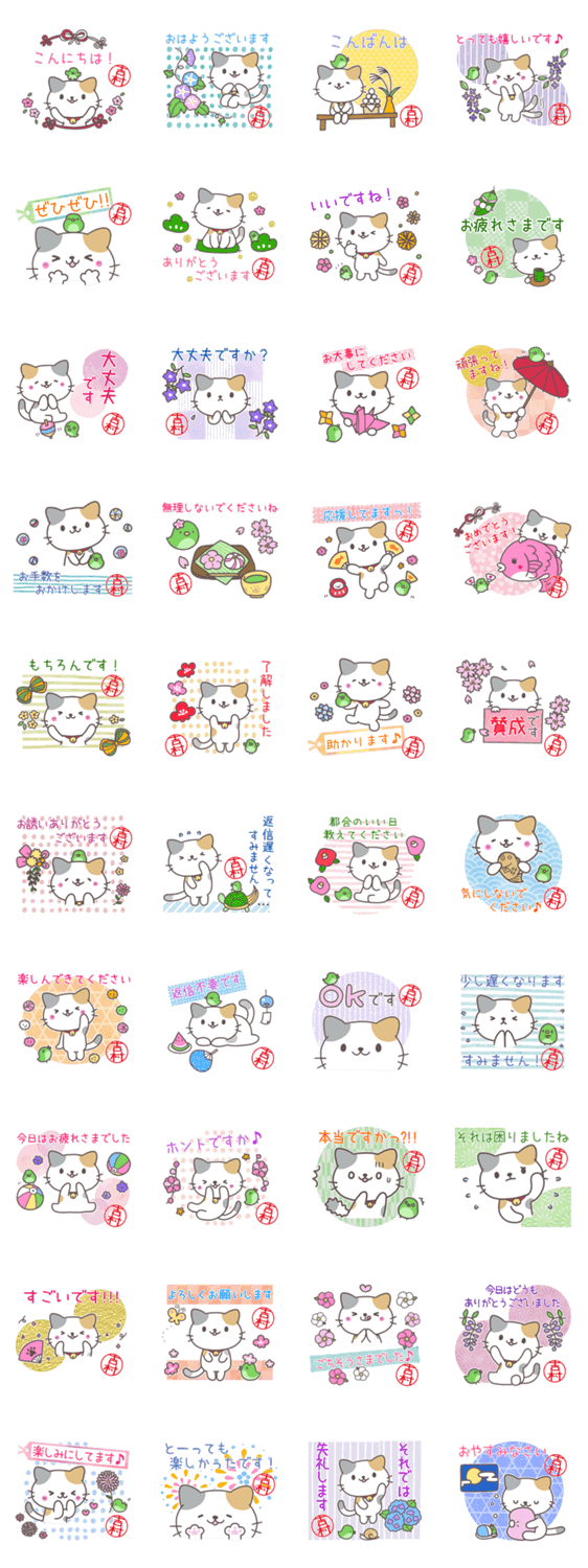 吉村さんの名字ハンコ付き、優しい和風敬語。三毛猫の小梅ちゃんとウグイスちゃんが、あなたの気持ち届けます。挨拶、気づかい、感謝、丁寧な言葉などをセレクト。