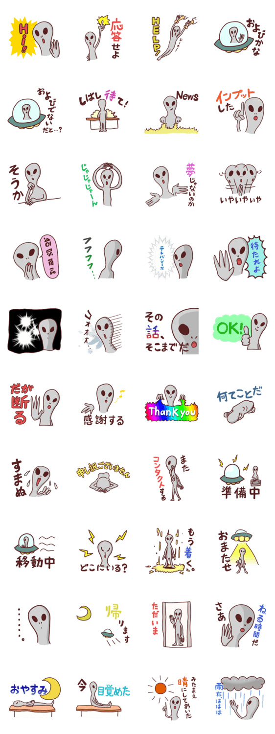 友好的な宇宙人田中さんのスタンプです。宇宙人だけにマナーがなっていない所もございますので、ご使用時はお気をつけください。おもしろシュールスタンプ。