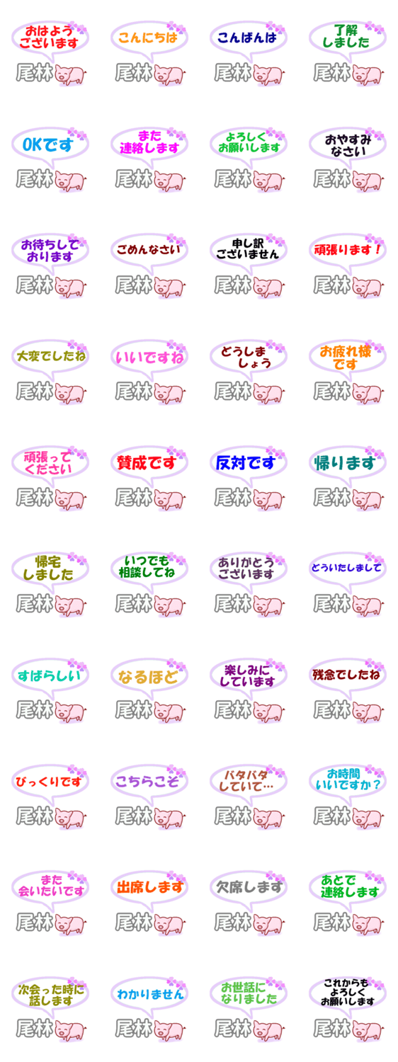 尾林「おばやし」さん専用。おはようございます、了解、出席、欠席、賛成、反対など大人の丁寧な日常会話、連絡用にどうぞ