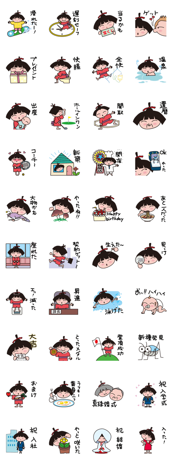 かわいい座敷童(ざしきわらし)がお祝い!いろいろなおめでたいシーンで使えるスタンプです。