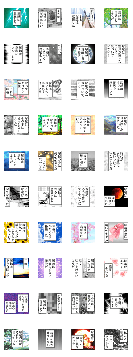 塚越(つかごし,つかこし,つかこえ,つかごえ)が使う、塚越の為の、塚越専用の名前ナレーションスタンプです。自分の気持ちをナレーションで語ってくれます。
