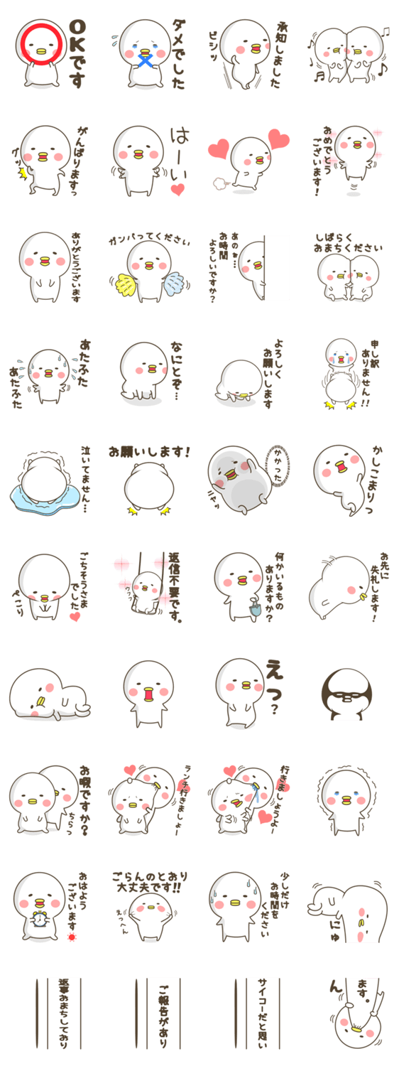 面白かわいいとりまるスタンプの敬語編です。ひよこともアヒルともとれるまん丸なとりまるの敬語スタンプです。ゆる敬語で上司や先輩など職場や学校で使えます。