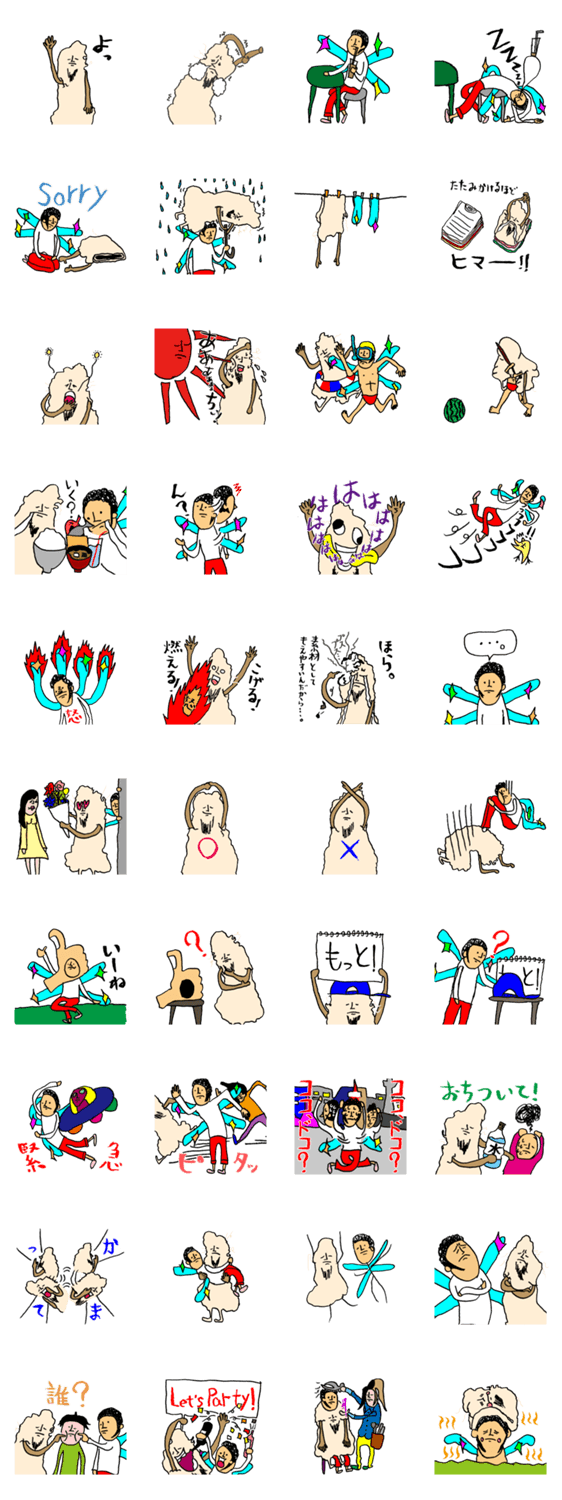 彼らは"チギレー・ヌーノ"と妖精"P"。擬人化したキモい千切れた布と、怠惰気味のパンチパーマの妖精です。ただ、言っている事は結構フツーな彼ら。そんなスタンプです。