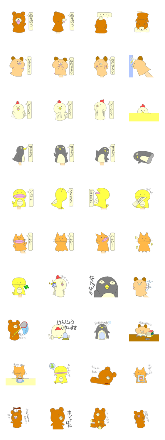 返事を催促するお手伝いをしてくれます。パペットの種類はくま、ハムスター、にわとり、ペンギン、ツチノコ、ネコの6種類です。