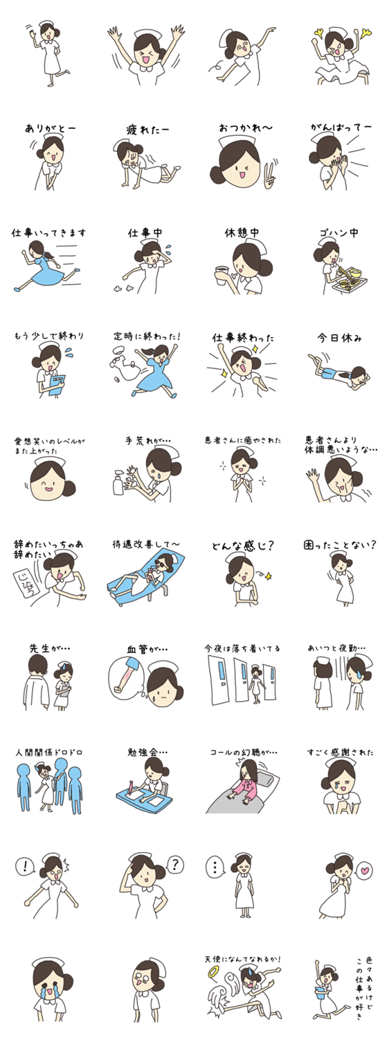 看護師さん、准看護師さんのためのスタンプを集めました。普段使えるものやナースあるあるです。使ってみてください。いつも大変な仕事ありがとうございます。