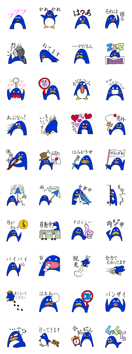 | スタンプ説明 | 白目のペンギンがなにか一言つぶやいています。性格はちょっちひねくれてます。 |