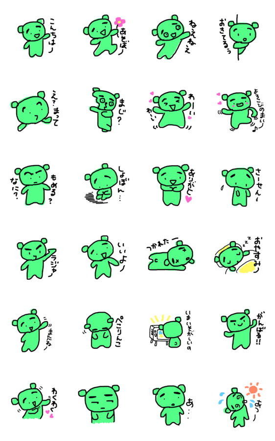 ちょっとまゆ毛の濃い、黄緑色のクマさんスタンプです。