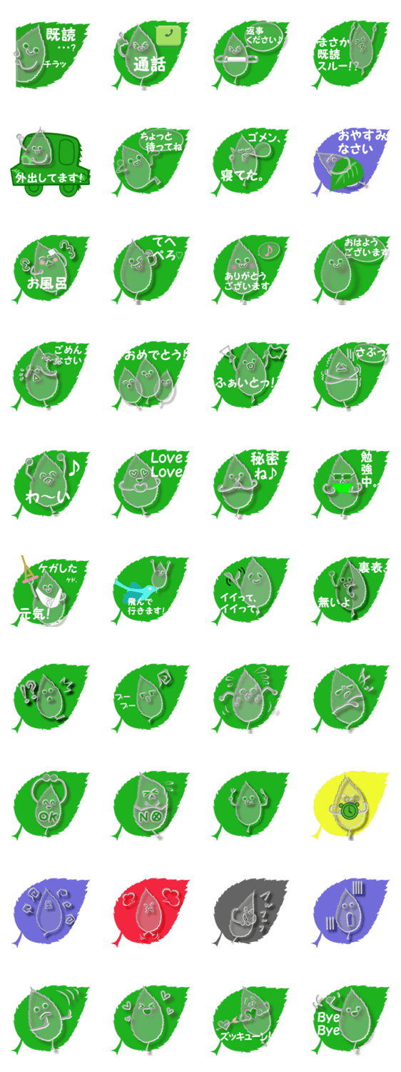 あら不思議、ガラスみたいな葉っぱのスタンプ。ありがとうございます、既読スルー、おはようございますの日常会話の使いやすい文字入りで、相手がびっくりする事間違いなし