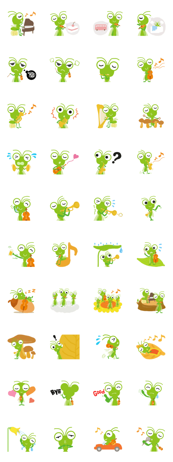 森のバッタ楽団が演奏する楽しい表情のスタンプです。