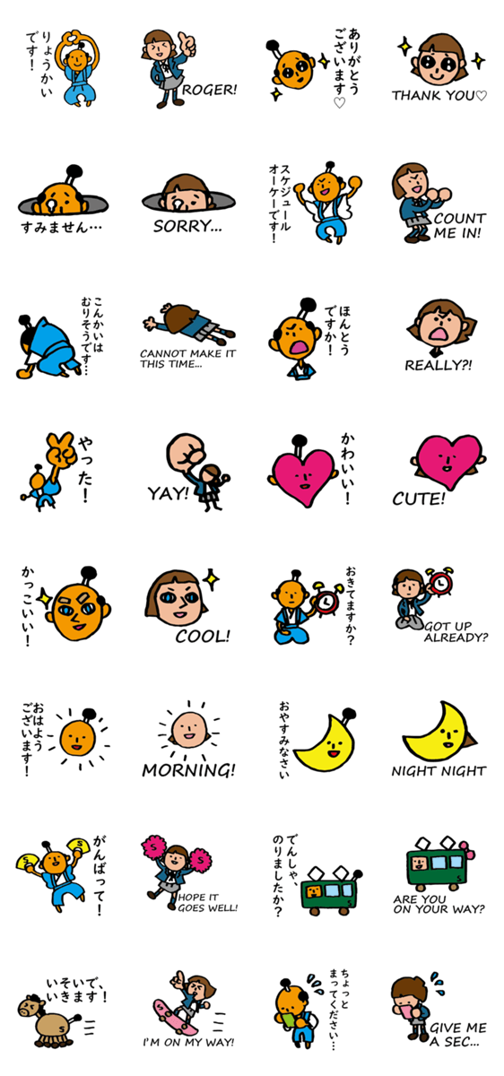 モデルさんが事務所との日常会話をスムーズにするためのバイリンガルスタンプです。使えば、長文打つ必要なし! 英語、日本語どっちも使ってね。