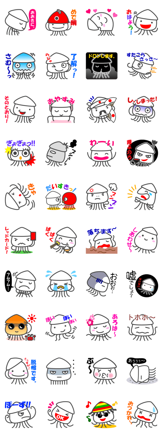 イカ・オンパレードのスタンプ登場。基本かわいく、たまに腹黒くなる性質。あれ、足の数が足りない?「能あるイカは足かくす」です。