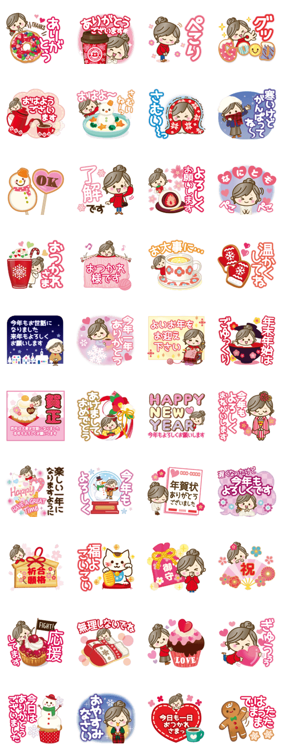 ナチュラルでやさしい女の子の年末年始&日常スタンプです♪年の瀬のご挨拶(大晦日)からお正月の年賀状代わりにもぜひ。合格祈願やバレンタイン…春まで長〜く楽しめます♪
