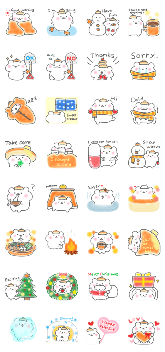 パンケーキぼうや第3段。冬バージョンの英語編です!寒い冬を暖かく過ごせるように、温もりあるタッチで描きました♡日常で使えるスタンプです!