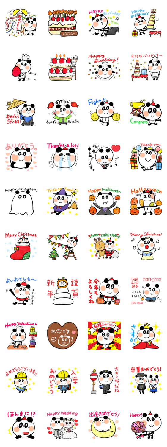 おめでとう、ありがとうを伝えるパンダくん。お誕生日はもちろん、入学、卒業、結婚、ハロウィン、クリスマス、お正月、バレンタインなどのハッピーイベントのおともに♪