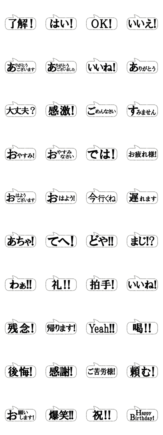 シニア中高年でも見やすい超デカ文字(でか文字)。日常よく使う単語の吹き出し型。男性も使いやすいイラストなし、文字だけの超シンプルなスタンプ。