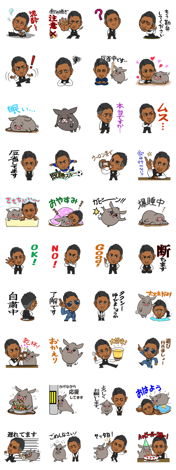元サッカー日本代表の前園真聖のスタンプ!テレビ番組で見せる表情や名言をラインナップ!大好きなミニブタのセブンちゃんも登場!前園真聖ワールドをご堪能ください。